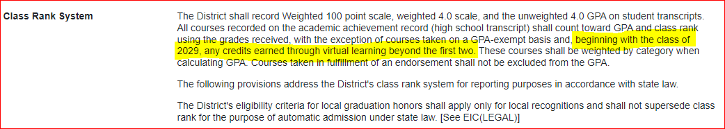 Board Policy EIC Local Update: Starting with the class of 2029 and beyond (incoming 9th graders), students will not receive AAC or AP credit for more than 2 advanced level courses taken with our approved external providers: Texas Virtual School Network(TXVSN), UT High School, and Texas Tech University ISD(TTUISD).