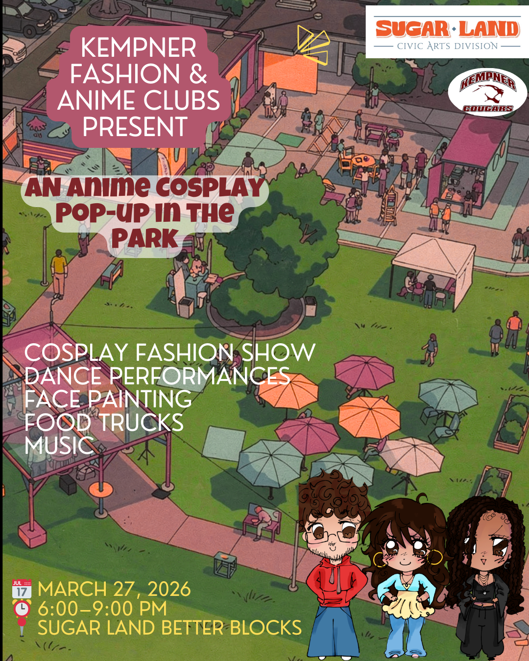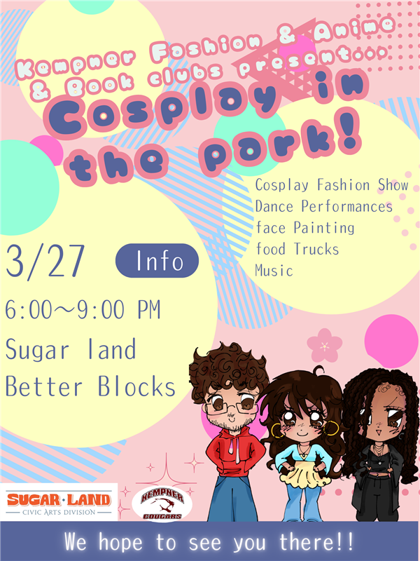 Kempner Fashion, Anime, & Book Clubs are hosting an amazing collaborative event with the City of Sugar Land Civic Arts division! We are inviting students throughout the district to participate in our Cosplay Fashion Show! The first 50 who sign up will be given priority. Students & families are welcome to attend - dressed in cosplay or not!