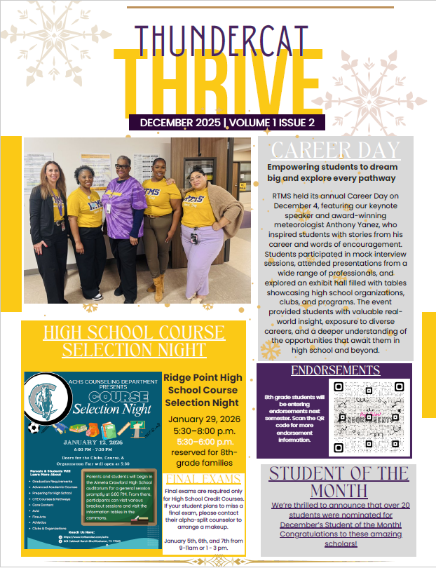 Professional School Counselors are available at Ronald Thornton Middle School to provide a Comprehensive Developmental Guidance Program and services for all students in the areas of: